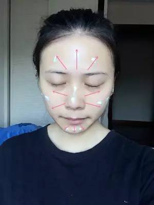 像這樣在臉部各個部位,隨意點上幾點,然后以鼻子為中心,發(fā)散涂抹均勻。鼻翼、眼下用手指按壓使底妝服帖。