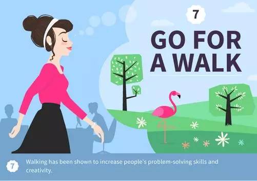 研究證明,散步有助于增強(qiáng)人們的創(chuàng)造力和解決問(wèn)題的能力。